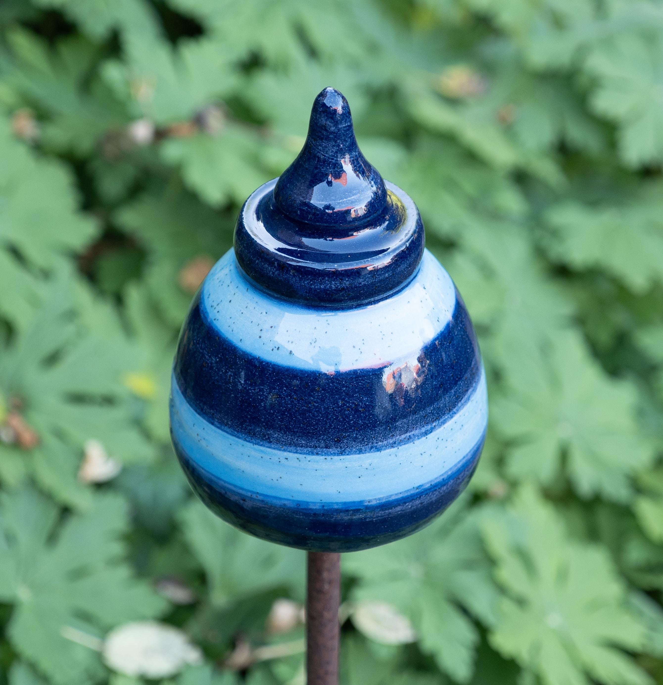 Die Gartenspitzen sind sehr dekorativ zwischen Blumen, Gräsern und Kräutern. Sie sind frostfest und sind auch im Winter ein schöner Farbtupfer im verschneiten Garten. Jede Gartenspitze ist ein Unikat. Sie werden auf der Drehscheibe gedreht und dann von Hand bemalt und glasiert. Die Form und die Farbe kann dadurch leicht variieren.