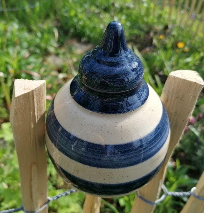 • Keramik Gartenstecker klein – blau gestreifte Gartenspitze ca. 12 cm, Öffnung 2–3 cm