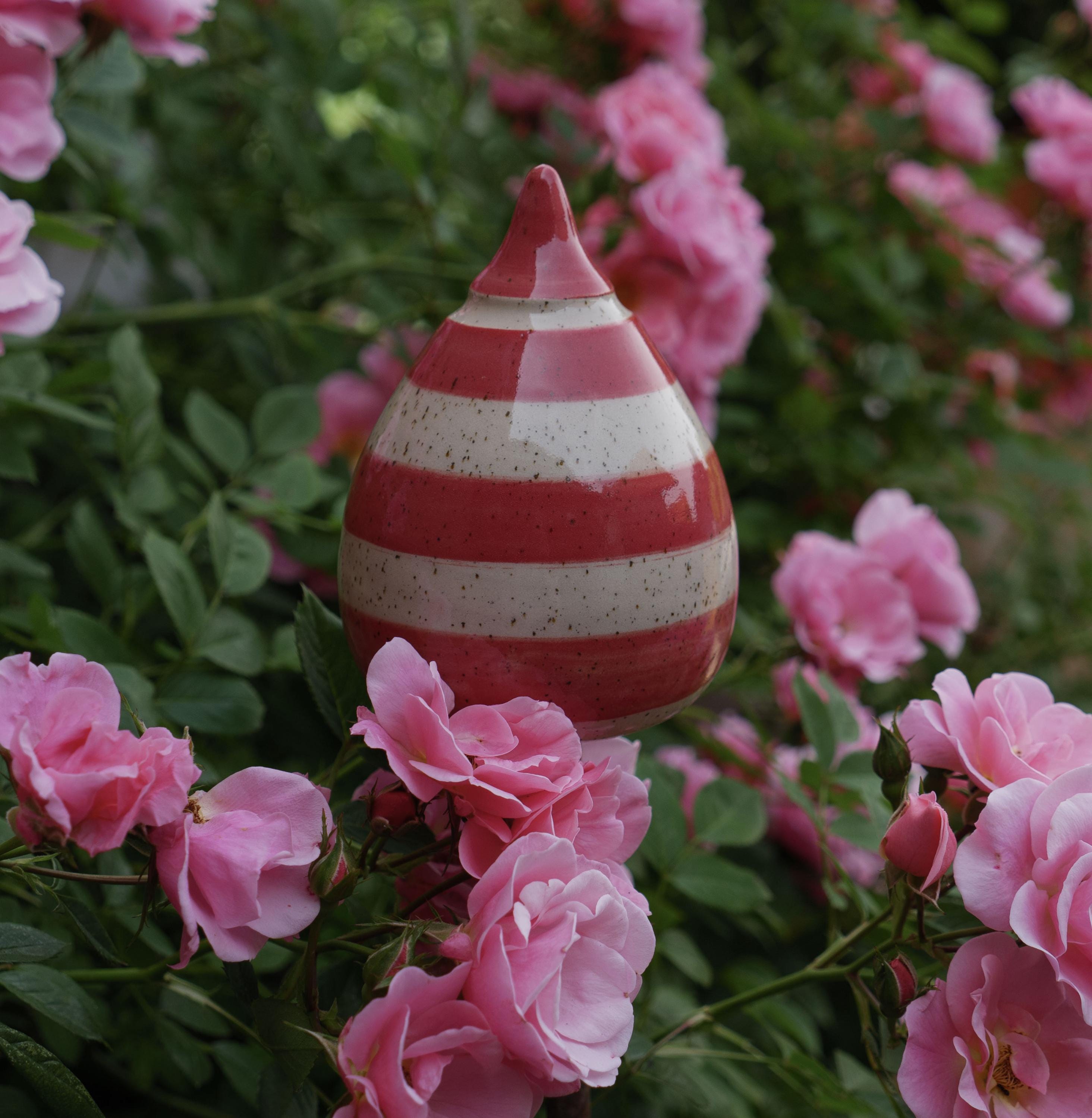 Die Gartenspitzen sind sehr dekorativ zwischen Blumen, Gräsern und Kräutern. Sie sind frostfest und sind auch im Winter ein schöner Farbtupfer im verschneiten Garten. Jede Gartenspitze ist ein Unikat. Sie werden auf der Drehscheibe gedreht und dann von Hand bemalt und glasiert. Die Form und die Farbe kann dadurch leicht variieren.
