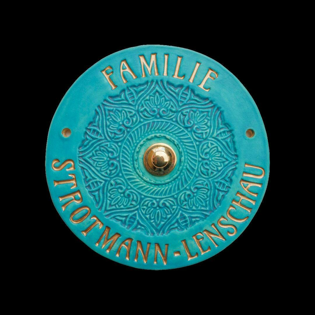 Unsere Keramik wird von Hand geformt, glasiert und bemalt. Auch die Muster trage ich von Hand, teilweise mit Stempeln auf (die wiederum handgefertigt sind), wodurch die Tiefe der Muster nicht immer gleich ist. Wir arbeiten beim Farbauftrag mit verschiedenen Techniken, indem wir einerseits Farbe mit dem Pinsel auftragen, aber auch Farbe durch vorsichtiges Wiederabnehmen der Glasur um die Buchstaben und Muster auf den Scherben aufbringen. Dabei ist es selbstverständlich, dass die Farbe nicht, wie bei einem Druck, völlig gleichmäßig auf der Keramik liegt, sondern dass Pinselstriche und leichte Ungleichmäßigkeiten der Glasur zu sehen sind. Kleine Abweichungen der Platten von ihrem grafisch dargestellten Entwurf sind produktionsbedingt und sprechen für die Einzigartigkeit Ihres Schildes.