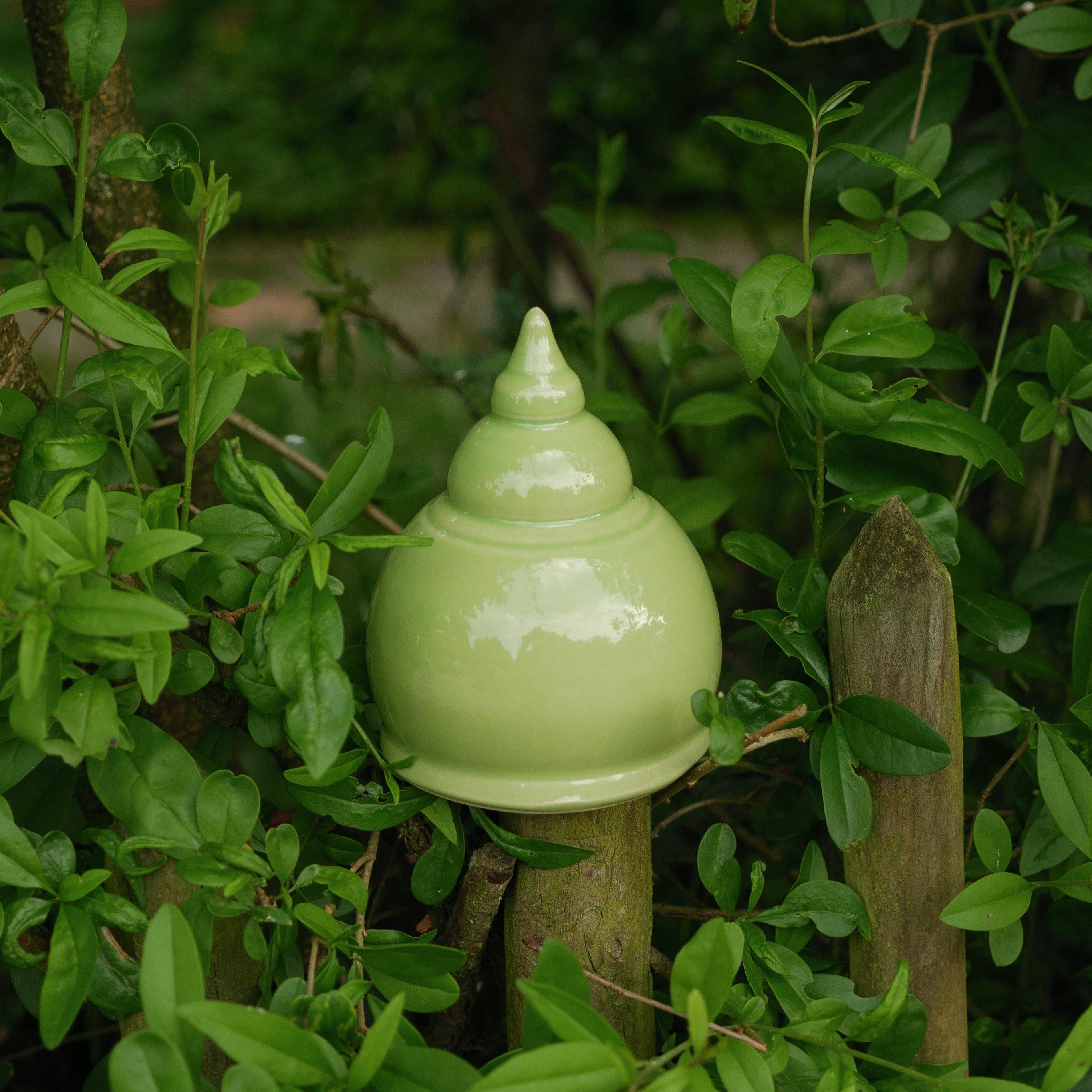 Die Gartenspitzen sind sehr dekorativ zwischen Blumen, Gräsern und Kräutern. Sie sind frostfest und sind auch im Winter ein schöner Farbtupfer im verschneiten Garten. Jede Gartenspitze ist ein Unikat. Sie werden auf der Drehscheibe gedreht und dann von Hand bemalt und glasiert. Die Form und die Farbe kann dadurch leicht variieren.