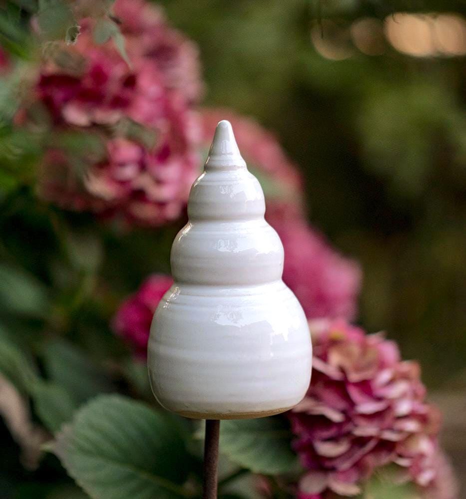 Die Gartenspitzen sind sehr dekorativ zwischen Blumen, Gräsern und Kräutern. Sie sind frostfest und sind auch im Winter ein schöner Farbtupfer im verschneiten Garten. Jede Gartenspitze ist ein Unikat. Sie werden auf der Drehscheibe gedreht und dann von Hand bemalt und glasiert. Die Form und die Farbe kann dadurch leicht variieren.